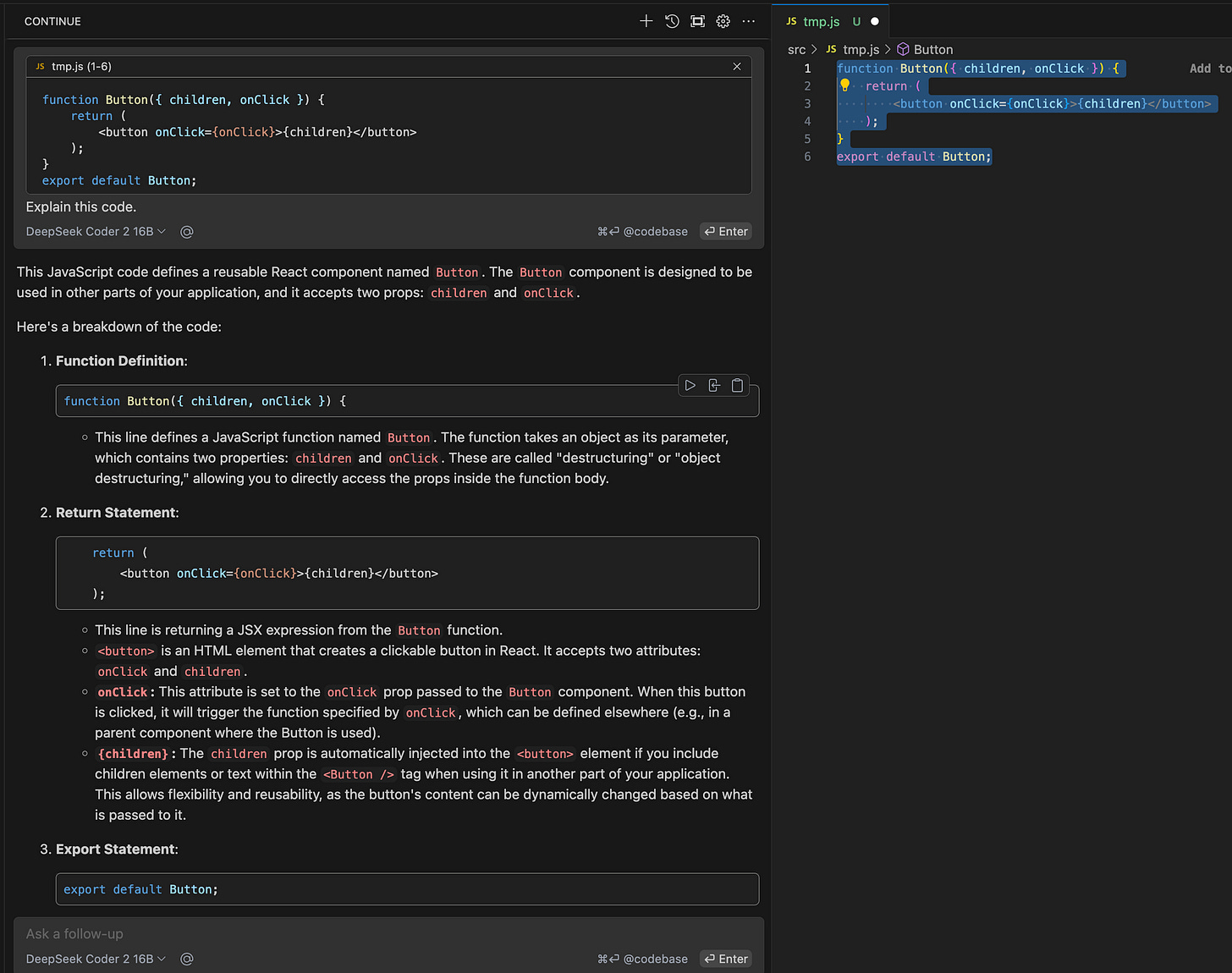 Let’s test it out. Ollama will run locally in the background, and continue.dev will tap into it for suggestions.